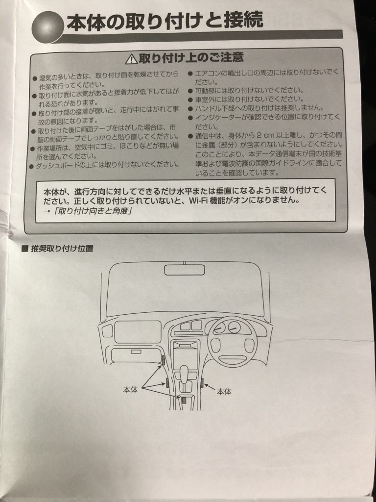 この車載用Wi-Fiルータですが、取り付けに注意があり、「この本体が進行方向に対してできるだけ水平または垂直になるように取り付けてください。」と説明書にはあります。