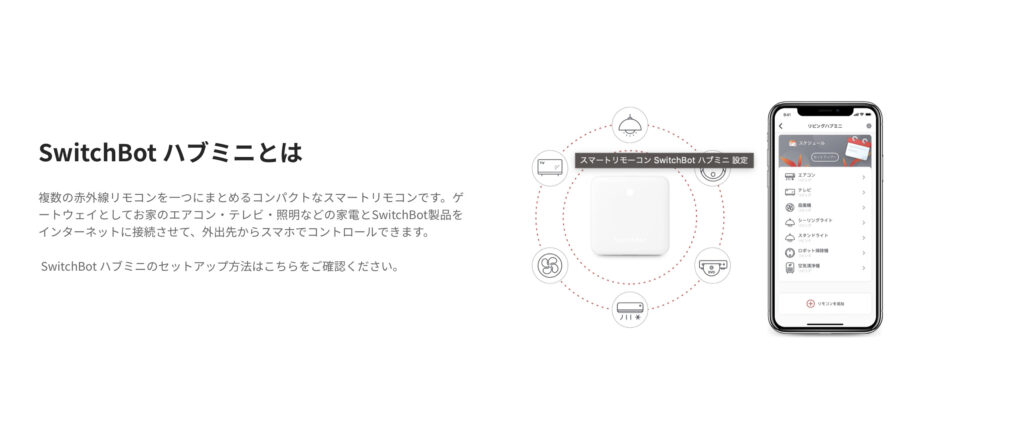 SwitchBotハブミニはインターネットに接続し、家にある既存のエアコンやテレビ、照明などの家電を外出先からスマホでコントロールできるようにする物です。